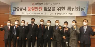 주제 : 건설공사 품질안전 확보를 위한 특별 좌담회 일시 : 2022년 3월 15일 (화) 오후 2시~ 주관 : 한국건설품질기술사회, 국토일보 주최: 한국건설품질기술사회, 한국건설품질안전기술원 장소 : 건설회관 3층 (소회의실) 참석자 : 국토일보 김광년 편집국장 (사회) 서정관 국토부 건설안전과장 오상근 서울과학기술대학교 교수 김영환 한국건설품질안전기술원 원장 김창수 한국건설품질안전기술원 부원장 최명기 한국건설품질기술사회 부회장 안동수 한국건설안전환경실천연합 사무총장 송명근 한국건설품질협회 부회장 김영섭 (주)화이에스에프 대표이사 장덕배 동양미래대학교 교수 내용 : 건설공사 품질안전 확보를 위한 좌담회에서 국내건설 (공공,민간)공사 품질확보 수준 과해외선진국의 품질관리 실태 비교 및 품질 관리 대가, 시험, 현장의 품질관리 실태등 단계별 품질확보 방안, 정부(국토부) 품질 확보 주요 정책과 건설공사 품질제고를 향한 전문가 메세지등을통하여 현장 품질관리의 중요성을 인식하는 계기가 되었다.업무협약(전국장애인건설노동조합)